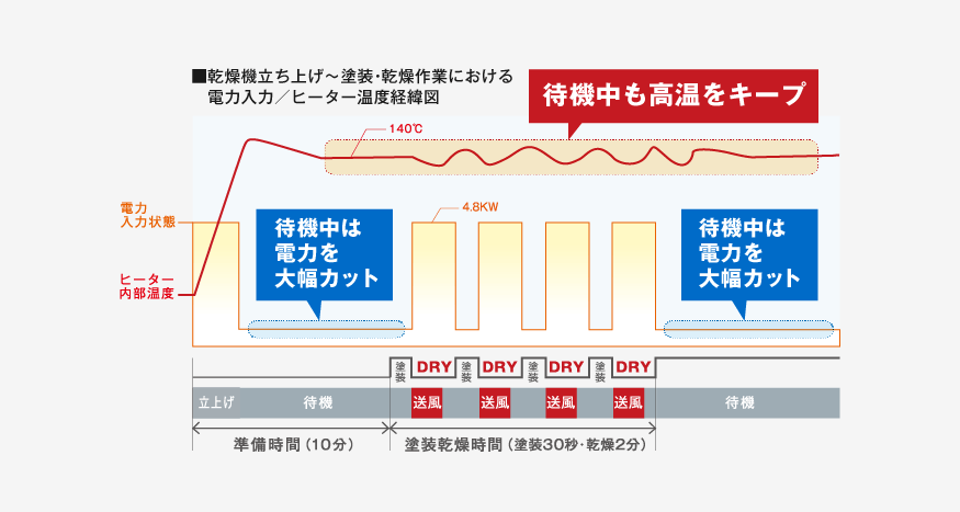 ヒーターに熱を蓄える待機機能の採用により、吹き付け作業時に、ムダなエネルギー消費を控えながら、